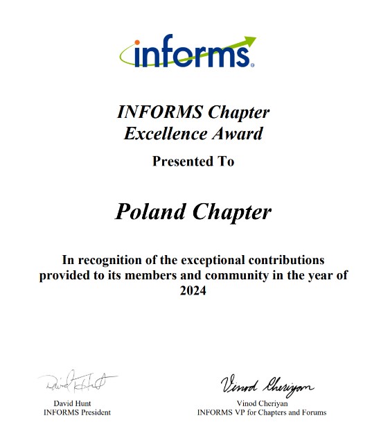 We are pleased to announce that the INFORMS Poland Chapter has received the INFORMS Chapter Excellence Award 2024 the Chapters and Forums